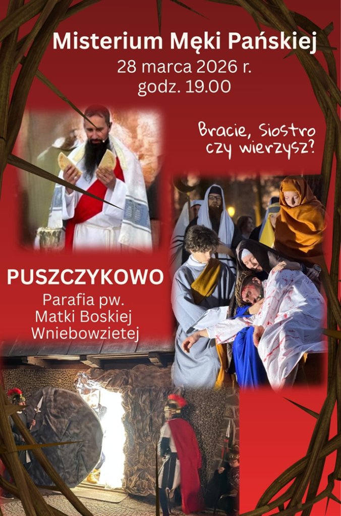 Z racji Wielkiego Postu, nasi parafianie i zaprzyjaźnieni z nasza parafią, również w tym roku pragną zaangażować się w tworzenie Misterium Męki Pańskiej. Będzie to już trzecia inscenizacja w naszej parafii, serdecznie zapraszamy chętnych, którzy chcieliby brać czynny udział w Misterium.